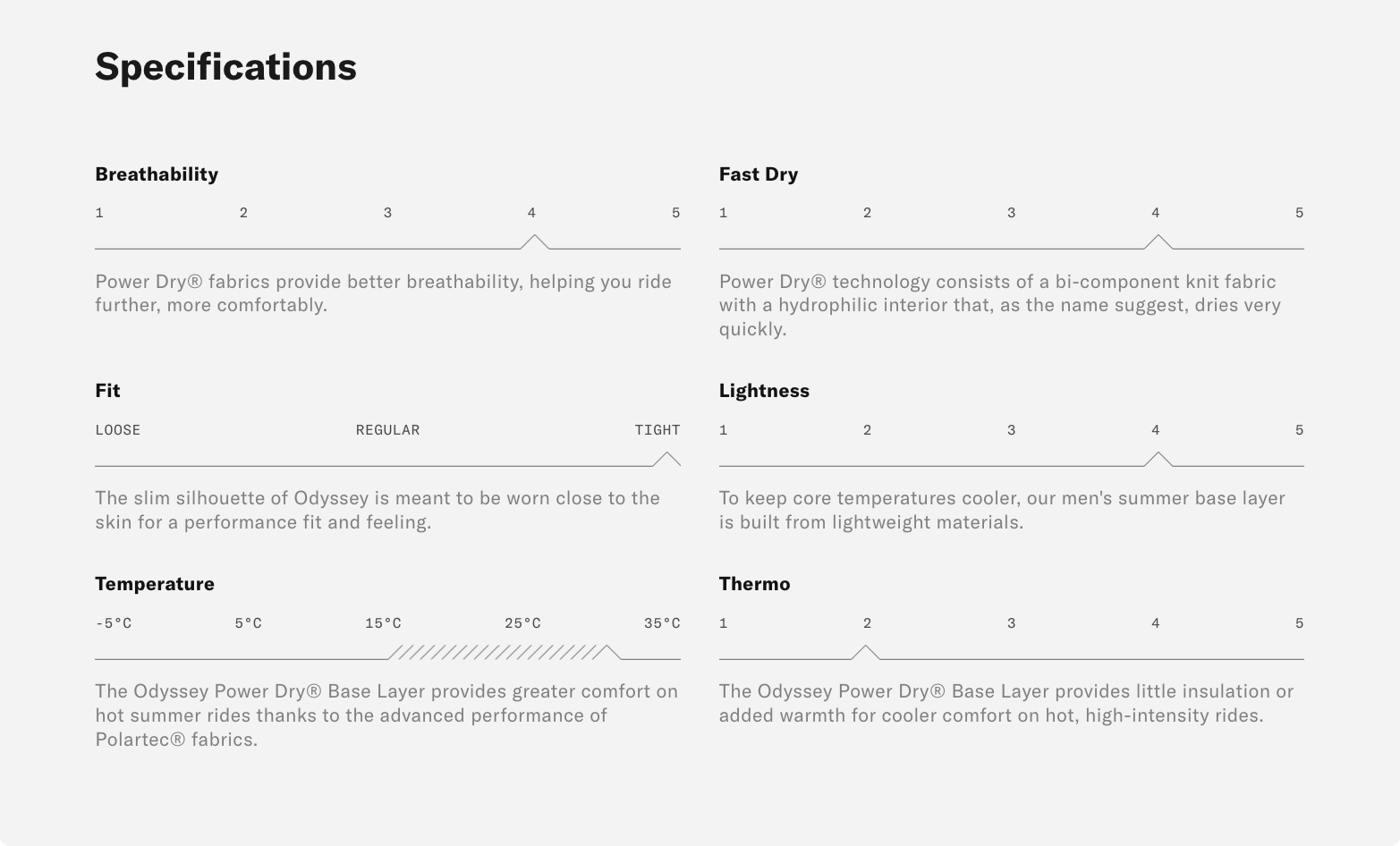 Temperature - The Odyssey Power Dry® Base Layer provides greater comfort on hot summer rides thanks to the advanced performance of Polartec® fabrics.