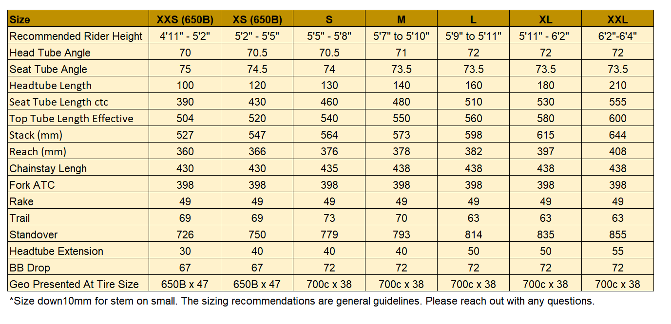 Gravel race geo with all-day comfort and bump absorption at the forefront. The tall stack, a slightly lowered bottom bracket, and generous stays yield an unbelievably smooth ride and inspire confidence when descending fast over loose terrain. Fairly traditional head tube and seat tube angles keep everything quick and maneuverable.